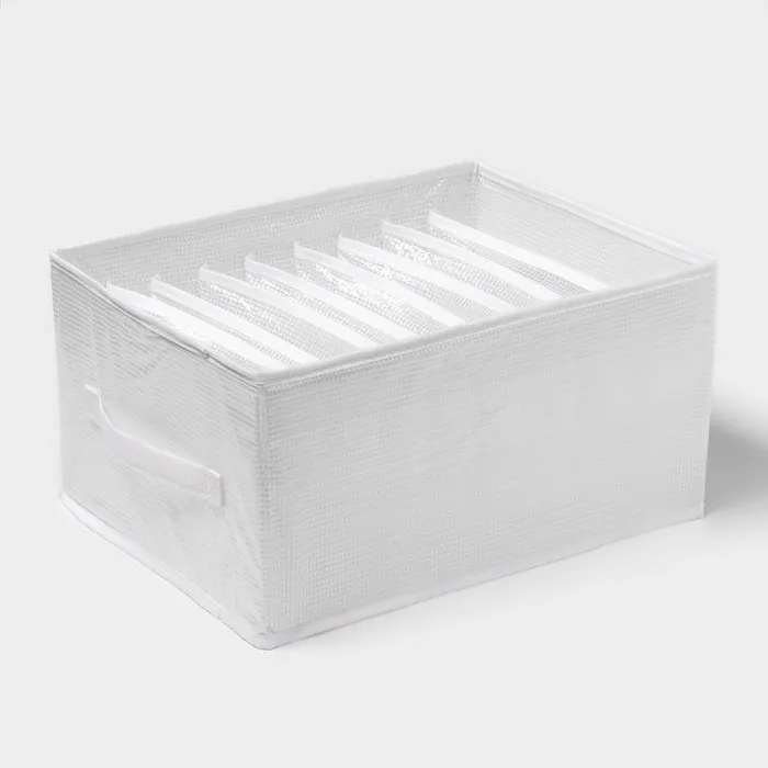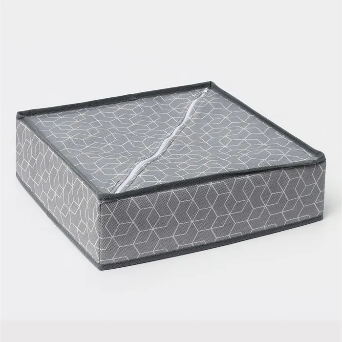 - Прямоугольный короб с легкостью поместятся на полке в многоярусном шкафу, секционном шкафчике и даже прикроватной тумбочке.