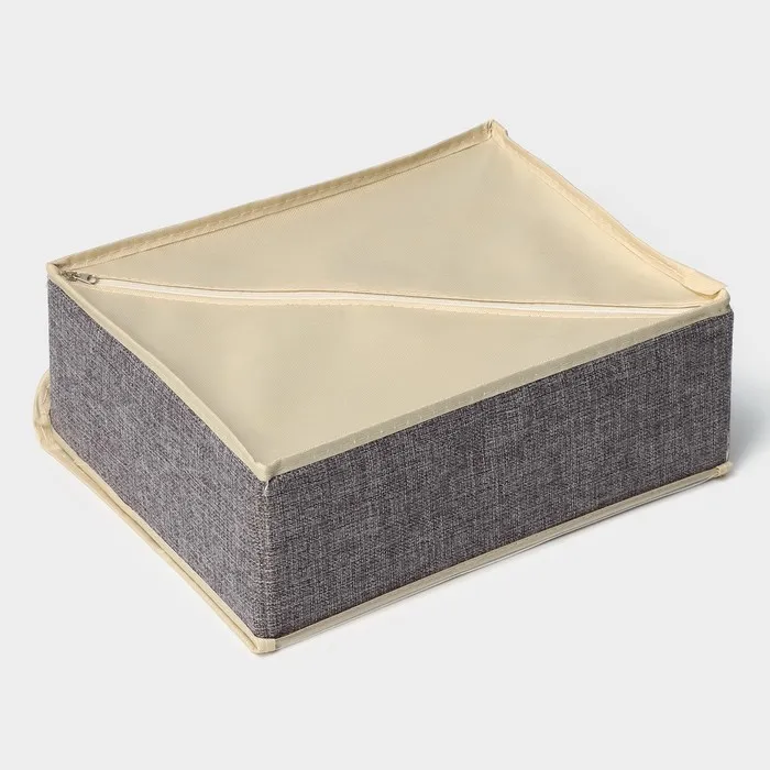 • Прямоугольный короб с легкостью поместятся на полке в многоярусном шкафу, секционном шкафчике и даже прикроватной тумбочке.