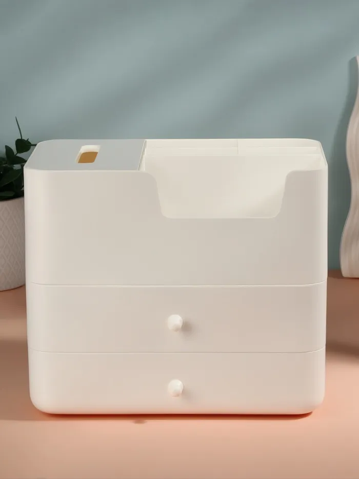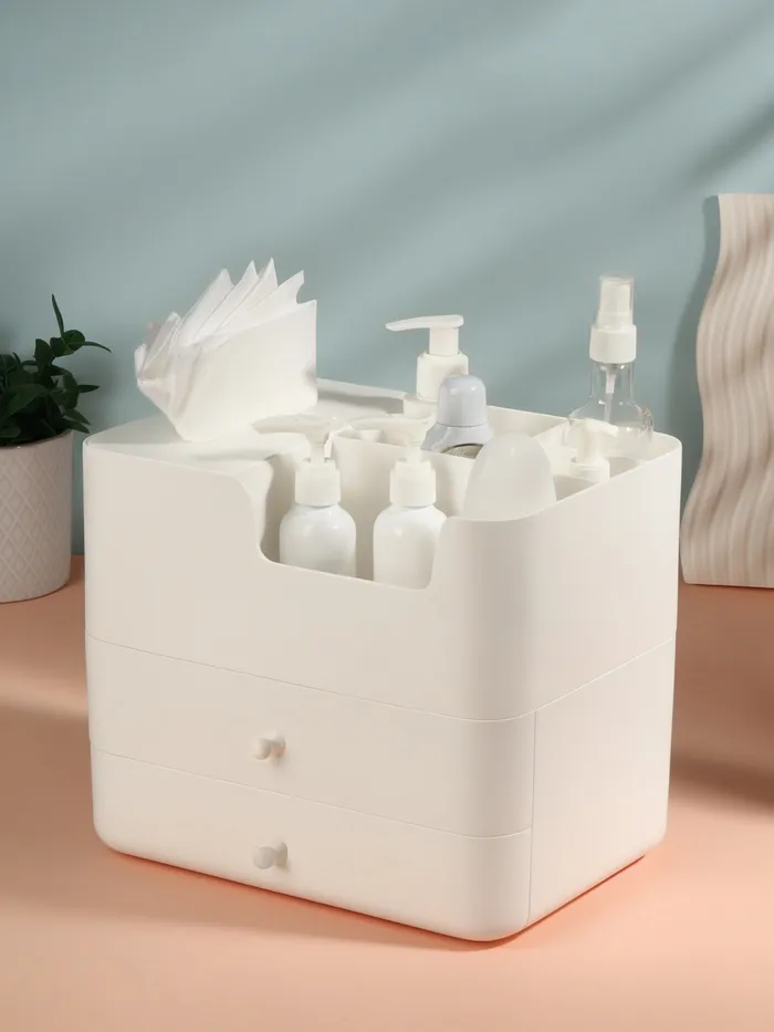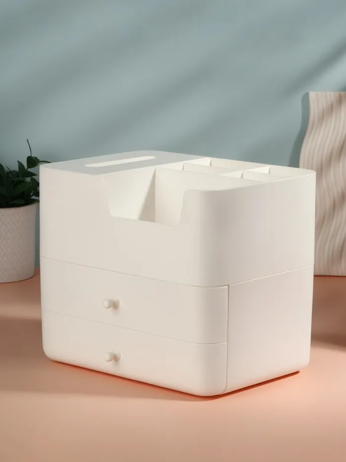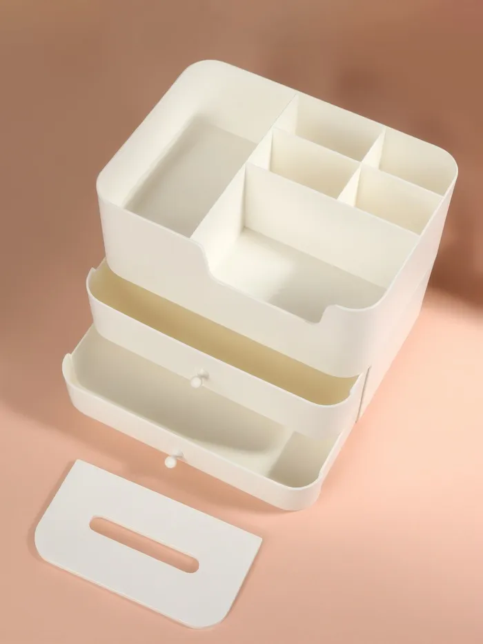 Органайзер выполнен из высококачественного пластика, что гарантирует его долговечность и устойчивость к ежедневному использованию. Два выдвижных ящика и шесть секций разного размера позволяют хранить множество предметов, поддерживая их в полном порядке и защищая от пыли. Открытая конструкция обеспечивает легкий доступ ко всем вещам, а многоуровневый дизайн экономит пространство и позволяет хранить еще больше.