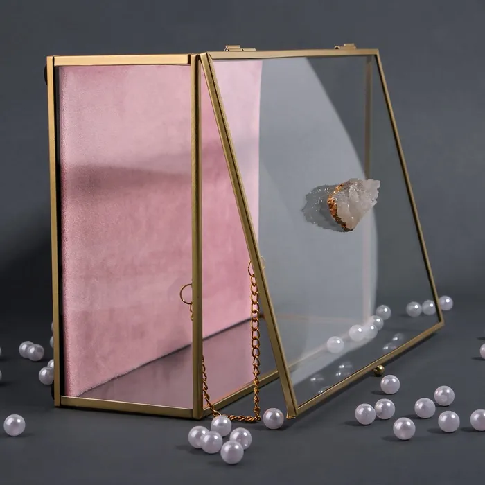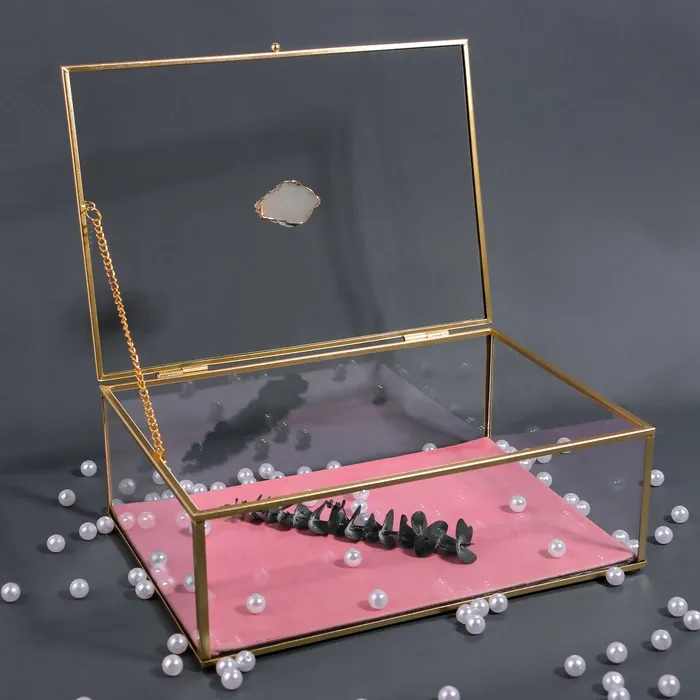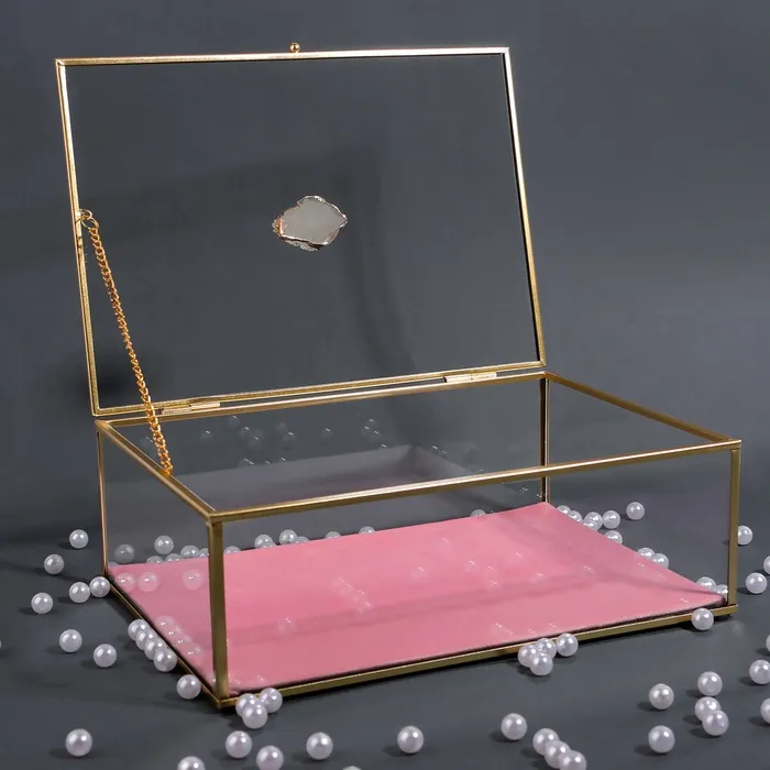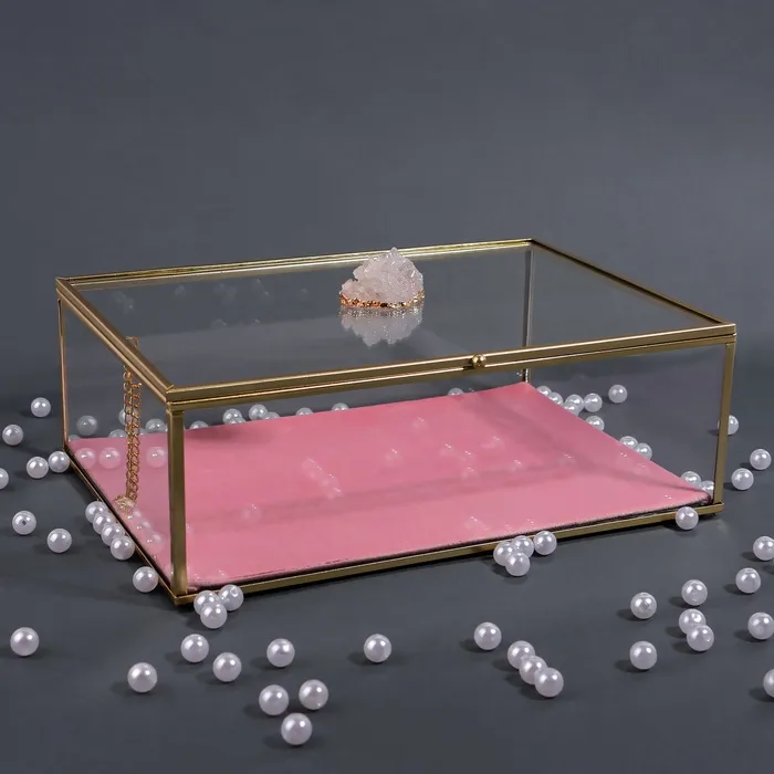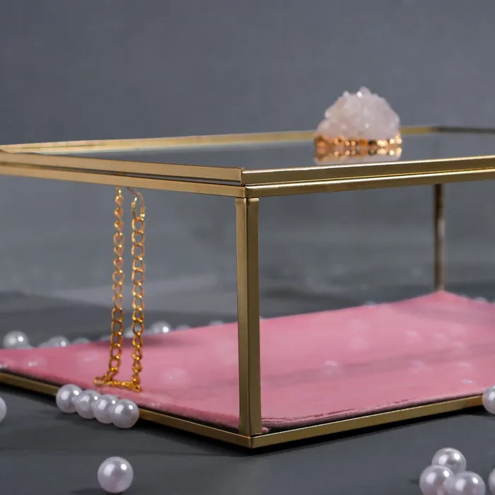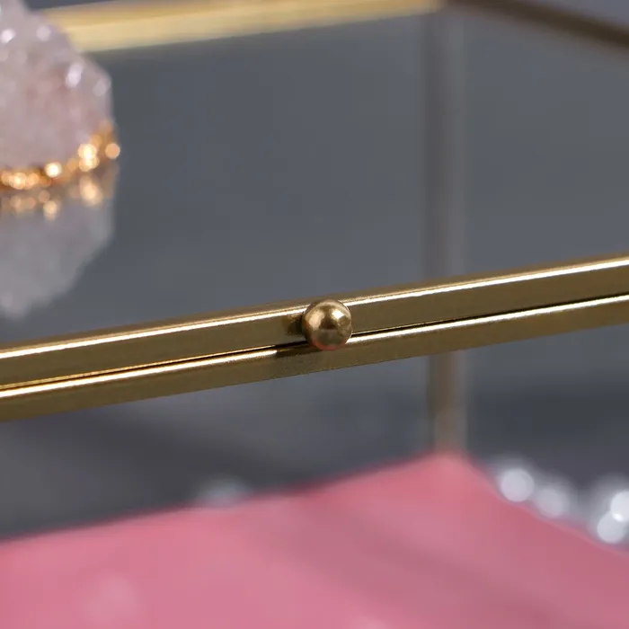 Созданный из прочного стекла с медными и розовыми элементами, органайзер гармонично впишется в любой интерьер, добавив нотку роскоши. Металлическая окантовка не только усиливает эстетическую привлекательность, но и обеспечивает дополнительную защиту. Благодаря крышке, ваши вещи будут защищены от пыли и загрязнений.