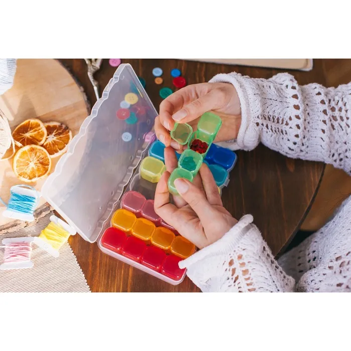 Что может быть лучше для мастерицы, чем аккуратная и организованная рабочая зона? В её создании вам поможет специальный контейнер. Он разделён на отсеки, куда вы сможете разложить отдельные детали или аксессуары. С ним вы не перепутаете и не рассыплете бисер, а прозрачный пластик, из которого изготовлен контейнер, позволит с лёгкостью найти нужный вам цвет и размер бусин.