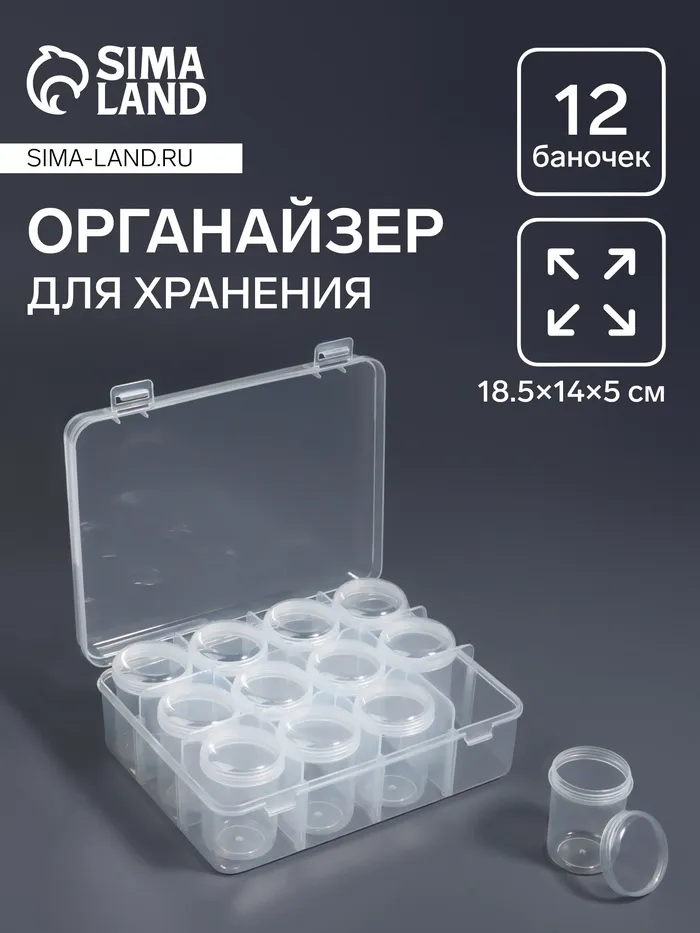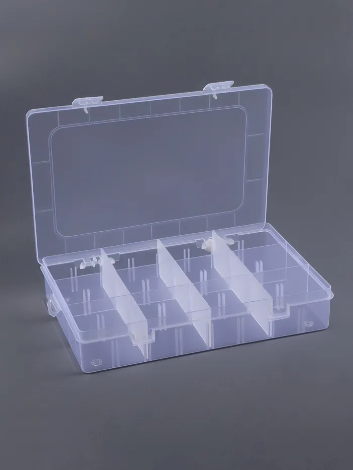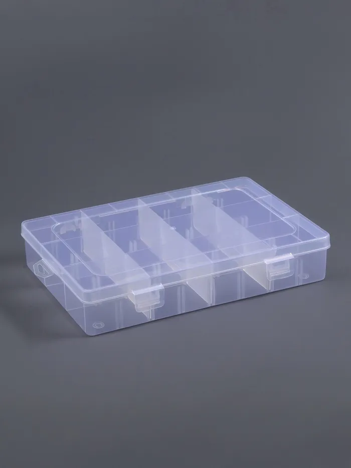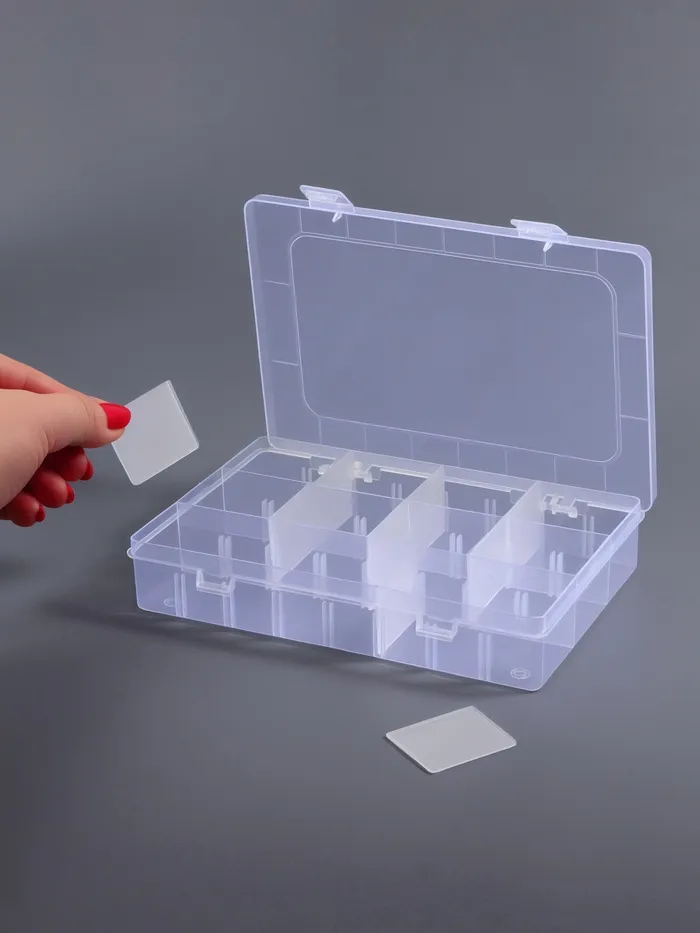 Органайзер выполнен из прозрачного пластика, что обеспечивает удобный обзор содержимого и помогает быстро находить нужные элементы. Прочная крышка защищает содержимое от пыли и повреждений, а передвижные ячейки дают возможность адаптировать пространство под разные нужды — от бисера и страз до небольших инструментов и украшений.