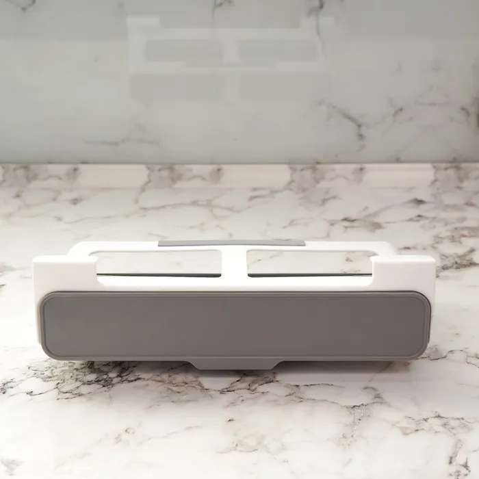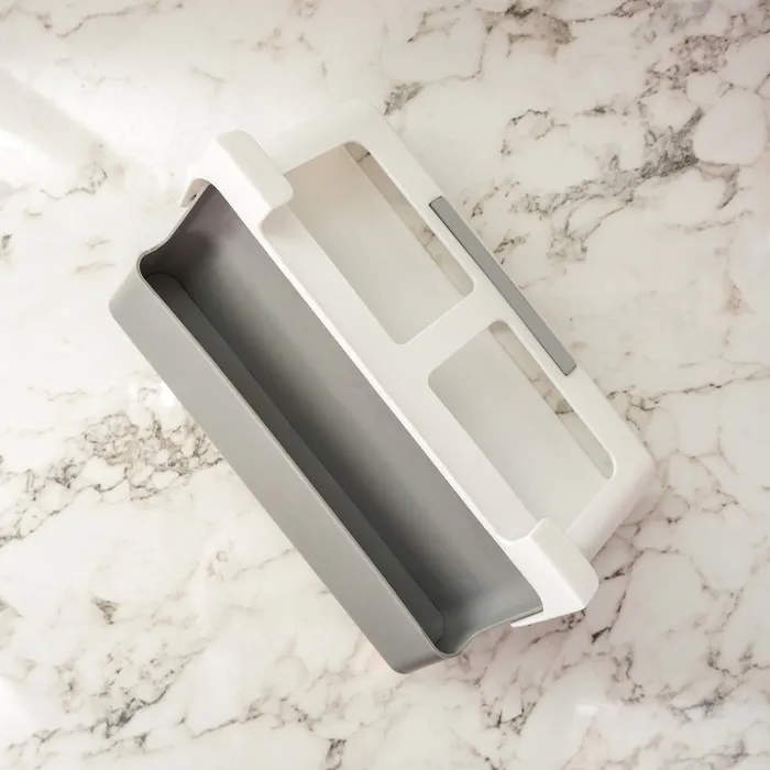 Изготовленный из прочного пластика, этот органайзер имеет белый цвет и компактные размеры. Он легко крепится к полке и не занимает много места.