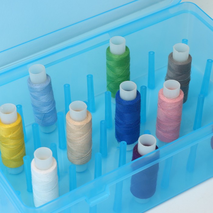 Органайзер изготовлен из прочного пластика и имеет 42 ячейки, в которых можно хранить мотки ниток разных размеров. Он компактный, не занимает много места и легко перемещается.