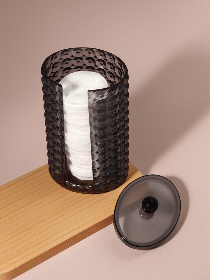 Стильный органайзер для ватных дисков поможет навести порядок среди гигиенических принадлежностей. Изделие отличается прозрачным корпусом, оригинальной крышкой и удобной боковой прорезью для извлечения дисков. Аксессуар способен вписаться в любой интерьер, сэкономив при этом место в шкафчиках или на вашей тумбочке.