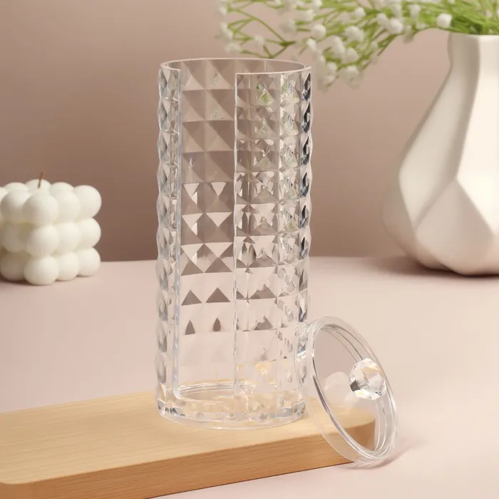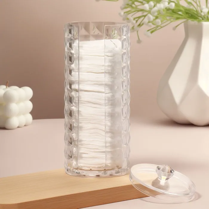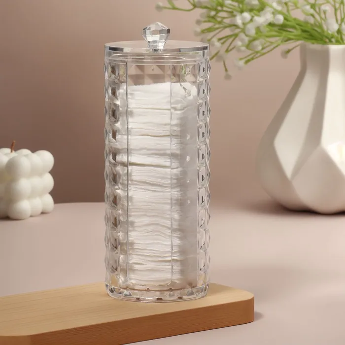 Организуйте пространство вашего дома с элегантным аксессуаром — стильным органайзером для ватных дисков с крышкой. Этот прозрачный органайзер размером 7 x 7 x 19 см не только помогает навести порядок среди ваших гигиенических принадлежностей, но и станет эстетичным дополнением любого интерьера. Прозрачный корпус позволяет легко видеть содержимое, а классическая крышка защищает диски от пыли и влаги, обеспечивая их чистоту и свежесть.