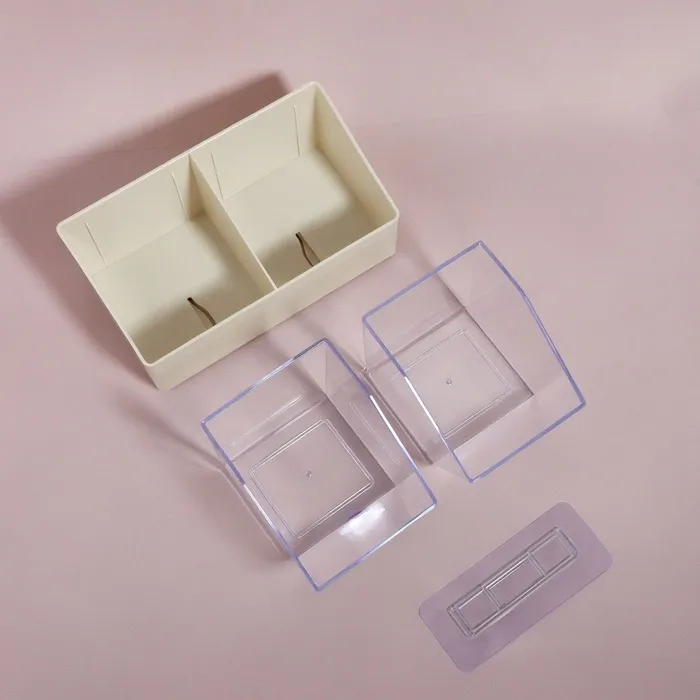 Органайзер выполнен из прочного пластика, имеет молочно-прозрачные стенки и бежевые акценты, что делает его универсальным и подходящим для любого интерьера. Прозрачная крышка позволяет видеть содержимое, защищая его от воды, пыли и грязи. Он идеально подходит для хранения косметических принадлежностей, таких как ватные диски и ушные палочки, сохраняя их в чистоте и порядке.