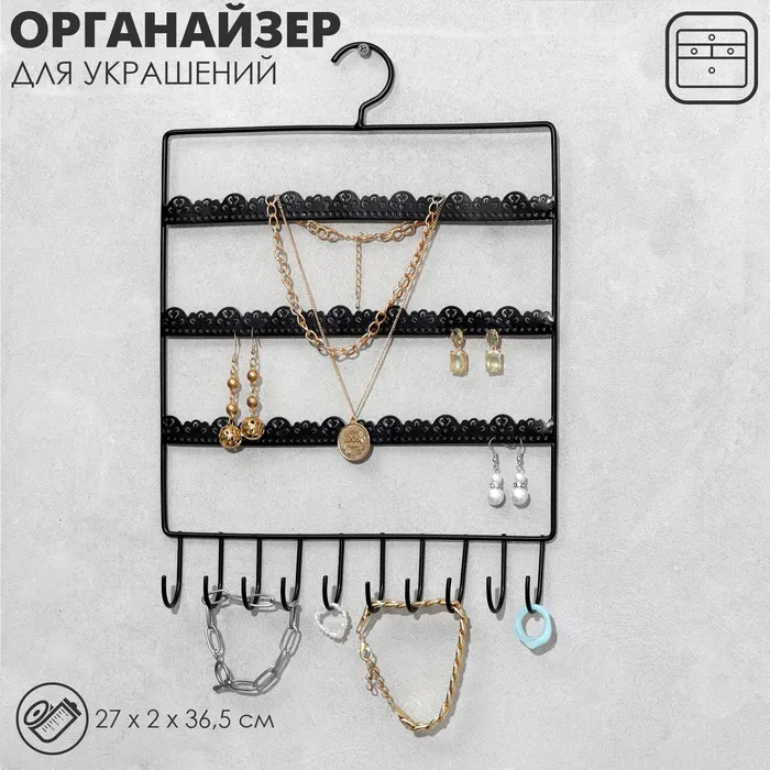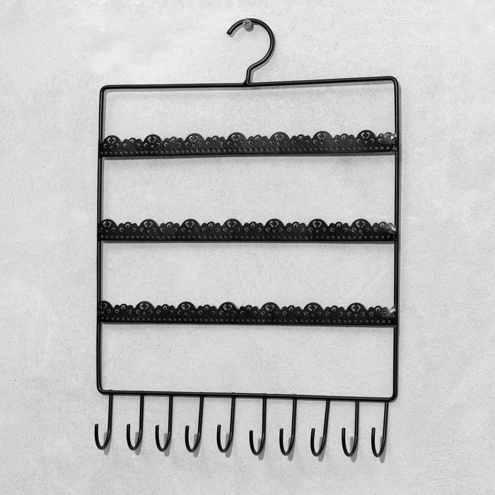 Органайзер настенный «Кружево» 3 ряда 10 крючков, 27×2×36.5 см, чёрный — Характеристики