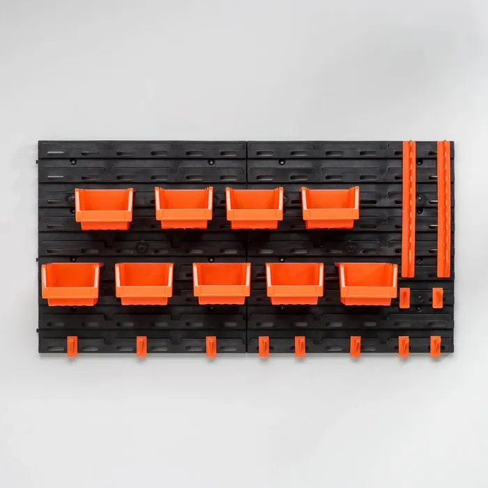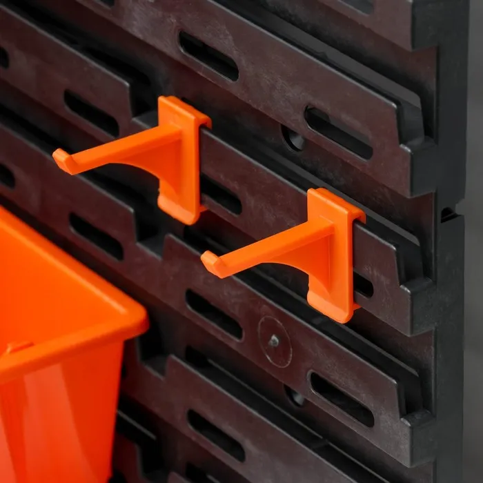 Лотки можно крепить к стене: настенные панели соединить между собой и закрепить с помощью шурупов (подобранных в соответствии с материалом поверхности для надёжного крепления), разместить на панели лотки, крючки и держатель.
