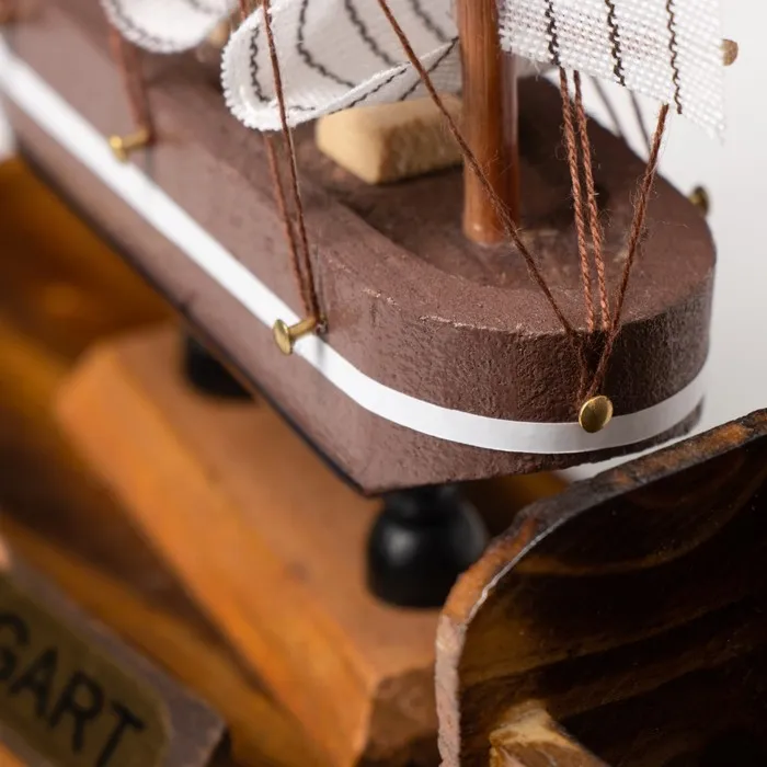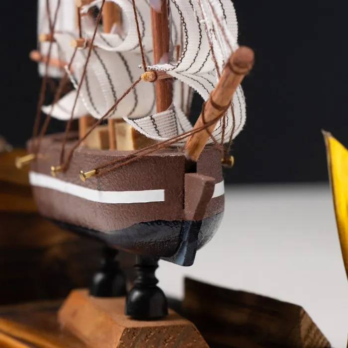 - Белый парус создаёт контраст с коричневым корпусом, подчёркивая детали корабля.