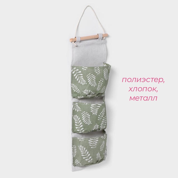 Органайзер подвесной с карманами Доляна Leaves, 3 отделения, 58×20 см, цвет зелёный — Характеристики