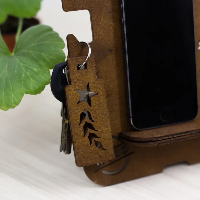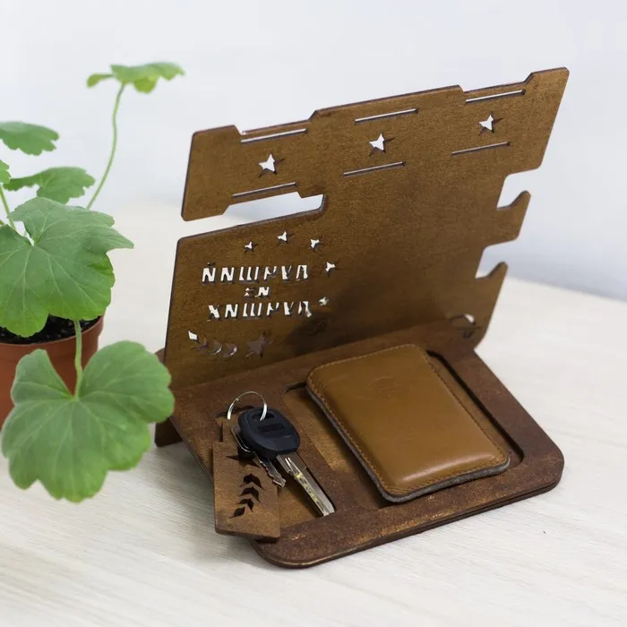 Органайзер станет украшением рабочего стола или прикроватной тумбочки и поможет навести на них порядок. Изделие имеет разъём для провода, позволяет хранить телефон, часы, запонки, серьги, ключи, мелкие аксессуары, банковские карты, визитки.