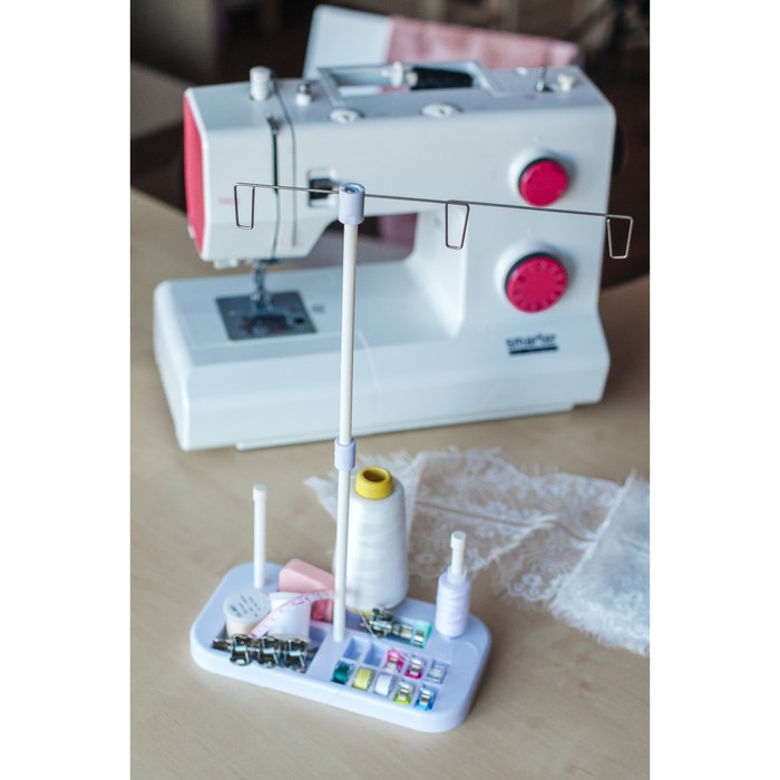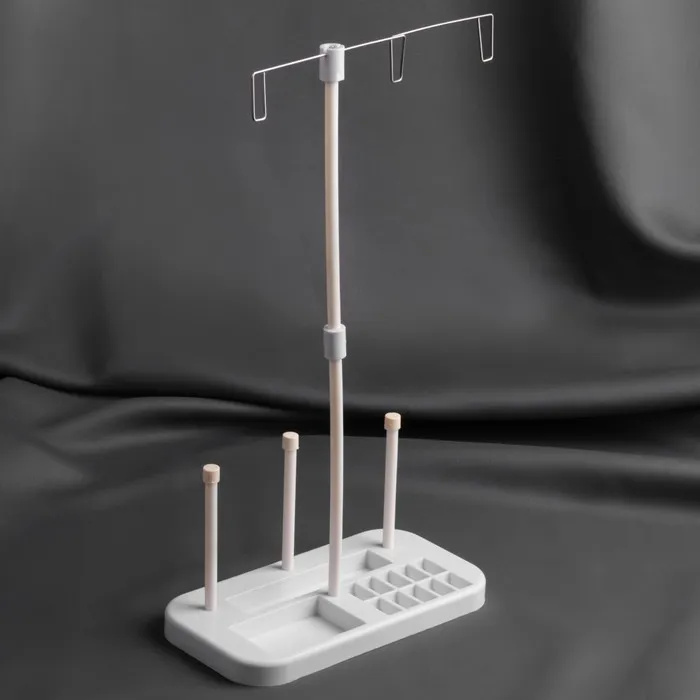 Стойка-органайзер для шитья и вышивания позволяет установить сразу три большие катушки ниток. Длинные вертикальные стержни надёжно удерживают высокие катушки с промышленной намоткой, обеспечивая равномерную подачу нити в нитепритягиватель.