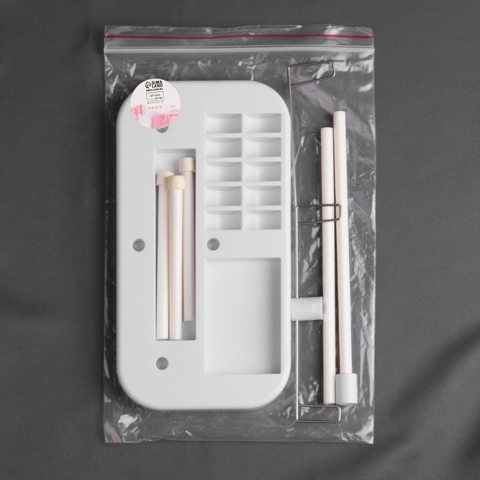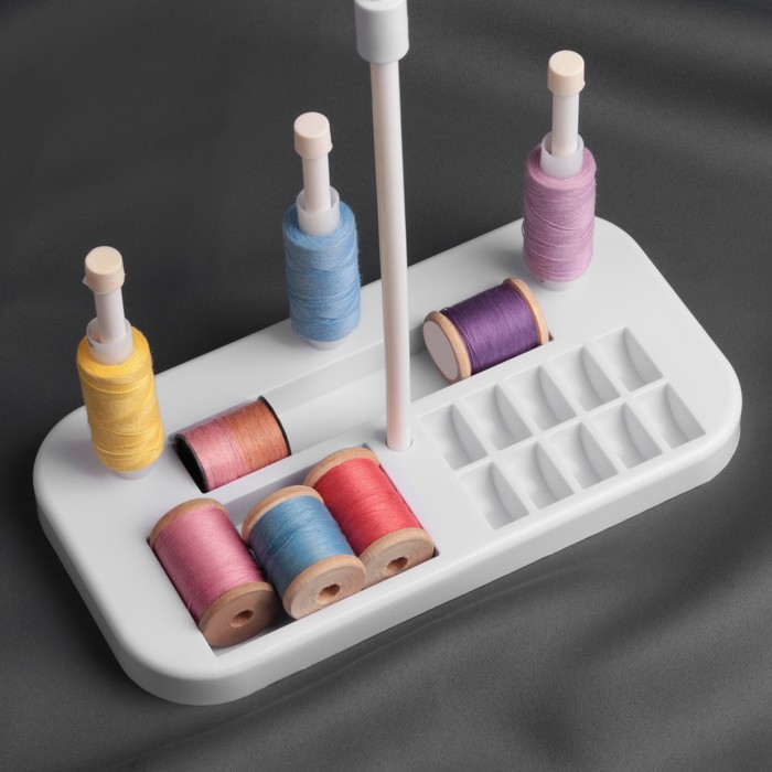 Стойка компактна и не занимает много места на рабочем столе. Дополнительно имеется 12 секций для хранения ниток, шпулек и других принадлежностей.