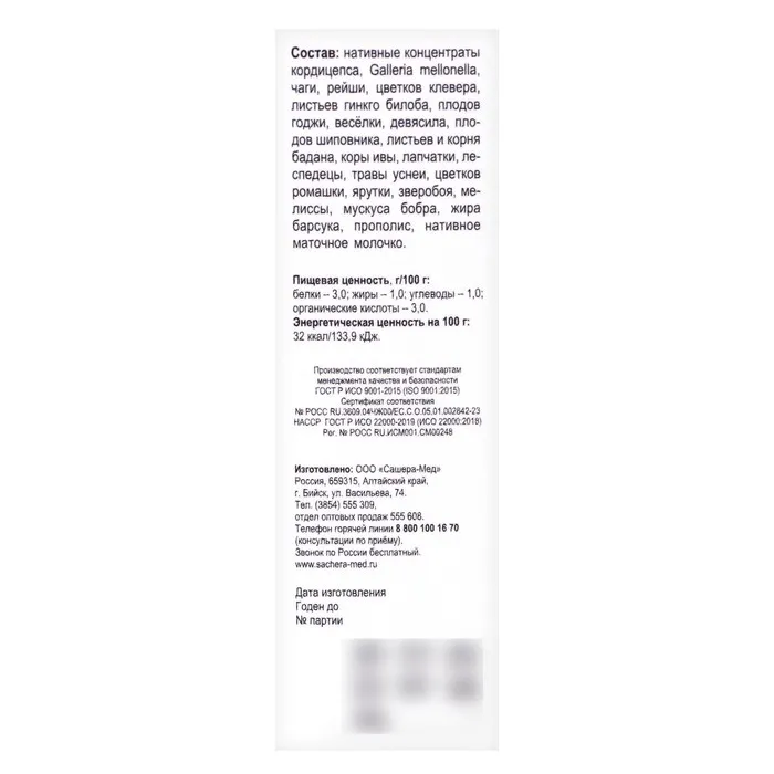 Состав: нативные концентраты кордицепса, Galleria mellonella, чаги, рейши, цветков клевера, листьев гинкго билоба, плодов годжи, весёлки, девясила, плодов шиповника, листьев и корня бадана, коры ивы, лапчатки, леспедецы, травы уснеи, цветков ромашки, ярутки, зверобоя, мелиссы, мускуса бобра, жира барсука, прополис, нативное маточное молочко.