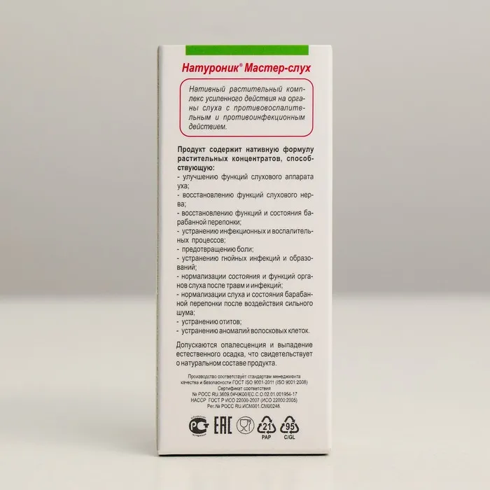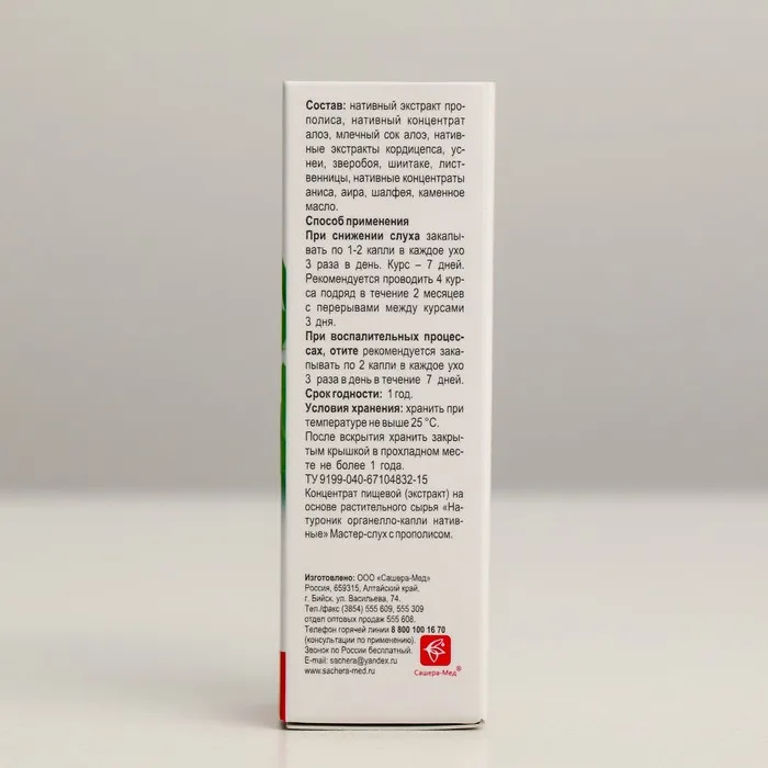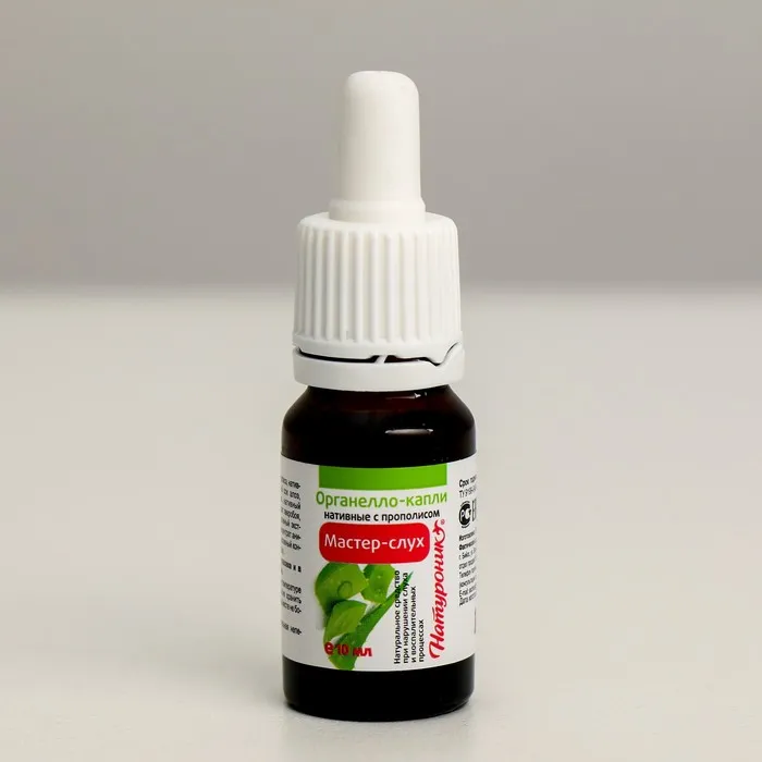 «Натуроник»® Мастер-слух с прополисом, органелло-капли – нативный растительный комплекс усиленного действия на органы слуха с противовоспалительным, антибактериальным, противоинфекционным действием. Нативные экстракты растений активизируют процессы регенерации и восстановления клеток слуховых органов при механических, травматических, нейросенсорных и инфекционных повреждениях барабанной перепонки, слухового нерва, волосковых клеток, восстанавливают кровообращение и передачу звуковых импульсов в мозг, в результате способствуют улучшению восприятия звука.
