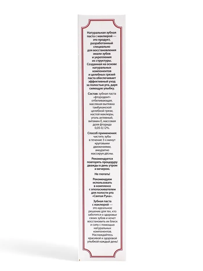 Здоровье организма всегда начинается с ухода за полостью рта. Так считали знахари, сохранившие рецепт натуральной зубной пасты, в основе которой маклюра и прополис. Считается, что прополис помогает бороться с кариесом, зубным камнем и налётом, а также восстанавливает эмаль. Маклюра, богатая кальцием, ценится за способности улучшать микрофлору ротовой полости, заполнять трещинки и повышать крепость зубов.