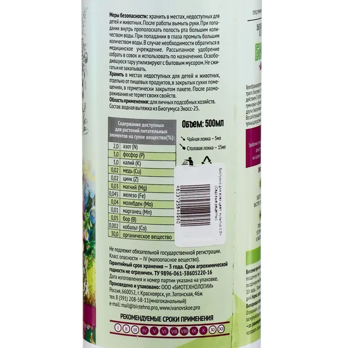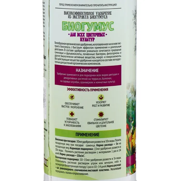 Органическое удобрение Биогумус "Садовые рецепты" для всех цветочных культур, 0,5 л — Характеристики