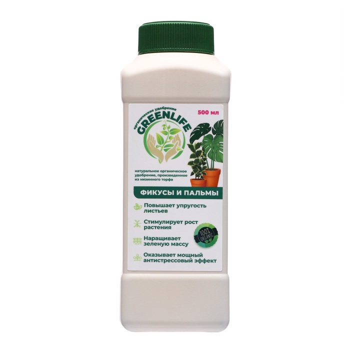 ""Органическое удобрение "Green Life" для фикусов и пальм"", объемом 0,5 л, представляет собой натуральное органическое удобрение, разработанное специально для обеспечения здорового роста и развития растений в домашних условиях. Продукт произведен из низинного торфа, что обеспечивает его высокую биологическую активность и уникальные свойства, способствующие ""улучшению почвы и стимуляции роста растений"".