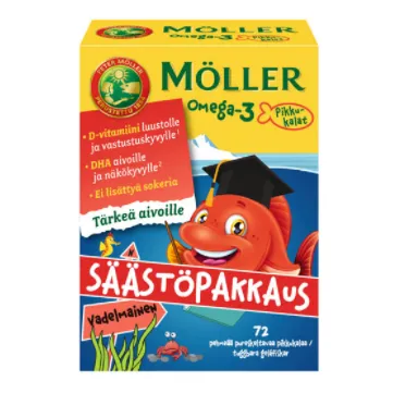 Möller Omega-3 Small Fish 72 штуки - это рыбий жир с витамином D3 в форме мягких гелей со вкусом малины для детей от 2 лет и старше. Мягкие, легко жевать или глотать.