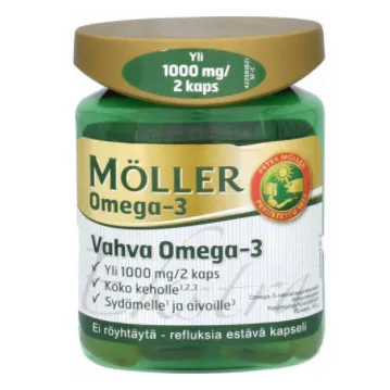 Möller Vahva Omega-3 содержит большую дозу незаменимых жирных кислот омега-3 (DHA + EPA), которые, как было доказано, улучшают работу сердца и поддерживают нормальный уровень триглицеридов в крови. DHA также важен для работы мозга и зрения. Две капсулы содержат более 1000 мг омега-3 жирных кислот.