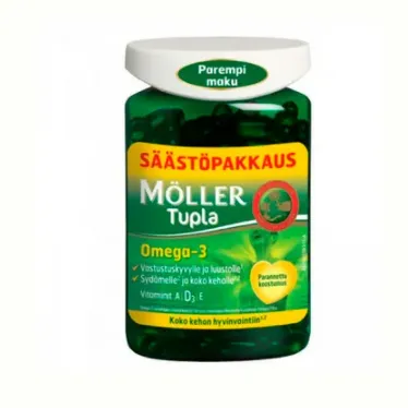 ORKLA HEALTH Möller Tupla Omega-3 + ADEvit. 150 капсул, это концентрированный рыбий жир в мягких желатиновых капсулах, обогащенный витаминами. 2 капсулы в день достаточно для удовлетворения потребности в витаминах A, D, E и омега-3 жирных кислотах. Möller TUPLA - отличная пищевая добавка для людей, которые едят рыбу реже одного раза в неделю или страдают аллергией на нее.