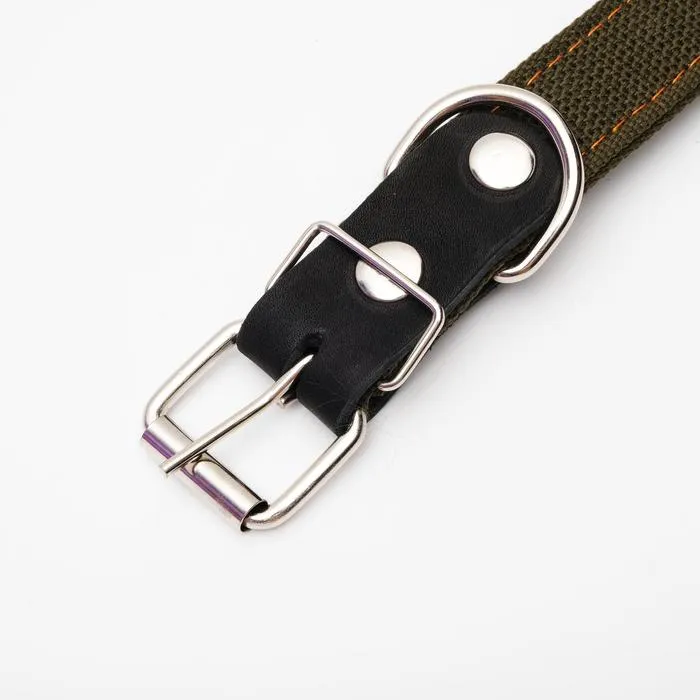 Ошейник полностью изготовлен из качественных материалов, таких как хлопок и полиэстер. Ошейник для собаки из брезента имеет в составе хлопок и полиэстер в соотношении 50% - 50%, что обеспечивает ошейнику высокую прочностью и долговечность.