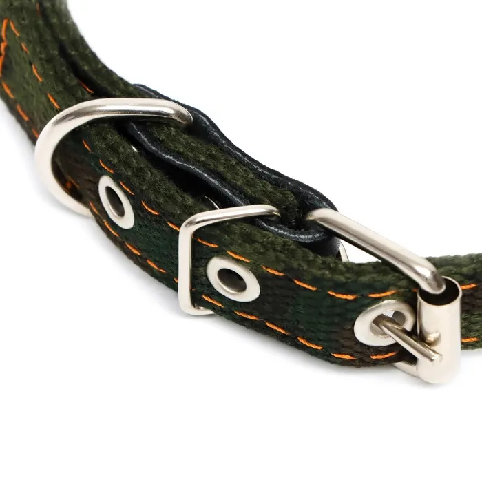 Ошейник полностью изготовлен из качественных материалов, таких как хлопок и полиэстер. Ошейник для собаки из брезента имеет в составе хлопок и полиэстер в соотношении 50% - 50%, что обеспечивает ошейнику высокую прочностью и долговечность.