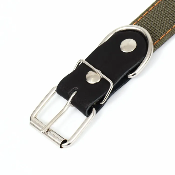 Ошейник полностью изготовлен из качественных материалов, таких как хлопок и полиэстер. Ошейник для собаки из брезента имеет в составе хлопок и полиэстер в соотношении 50% - 50%, что обеспечивает ошейнику высокую прочностью и долговечность.
