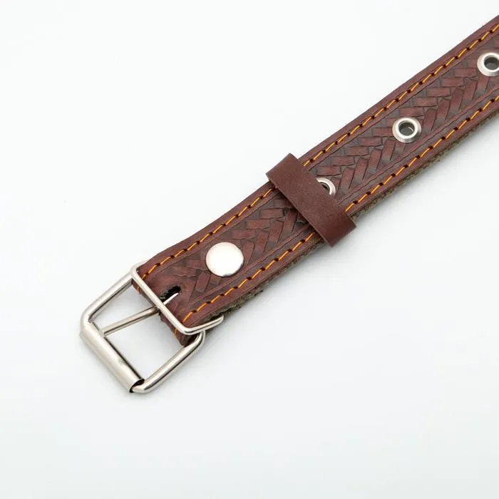 Прогулочный ошейник является неотъемлемой частью арсенала собачника. Наш кожаный ошейник обшит брезентом с внутренней стороны. Эта особенность предназначена для дополнительного комфорта собаки, и при этом лента не причиняет вреда шерсти. Ошейник сшит из цельного куска кожи и прошит толстой капроновой ниткой, для того, чтобы ошейник радовал Вас и Вашего питомца продолжительное количество времени. Ошейники оснащен полукольцом для пристегивания карабина поводка.