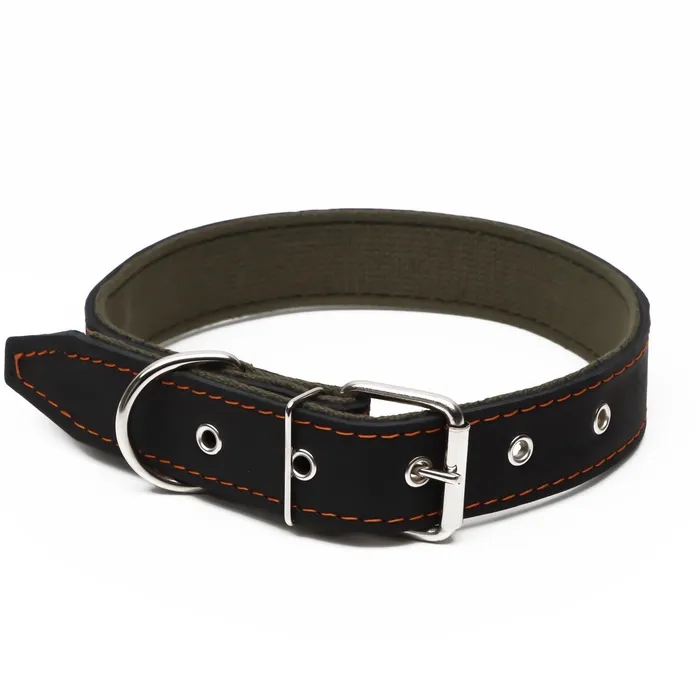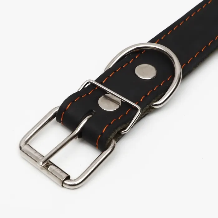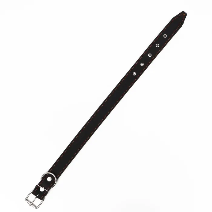 Эта особенность предназначена для дополнительного комфорта собаки, и при этом лента не причиняет вреда шерсти. Ошейник сшит из цельного куска кожи и прошит толстой капроновой ниткой, для того, чтобы ошейник радовал Вас и Вашего питомца продолжительное количество времени. Ошейники оснащен полукольцом для пристегивания карабина поводка.