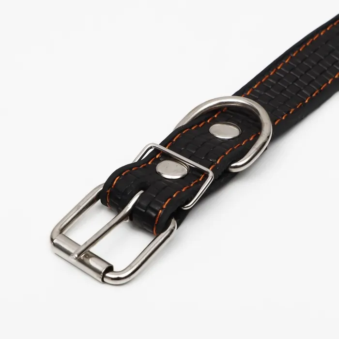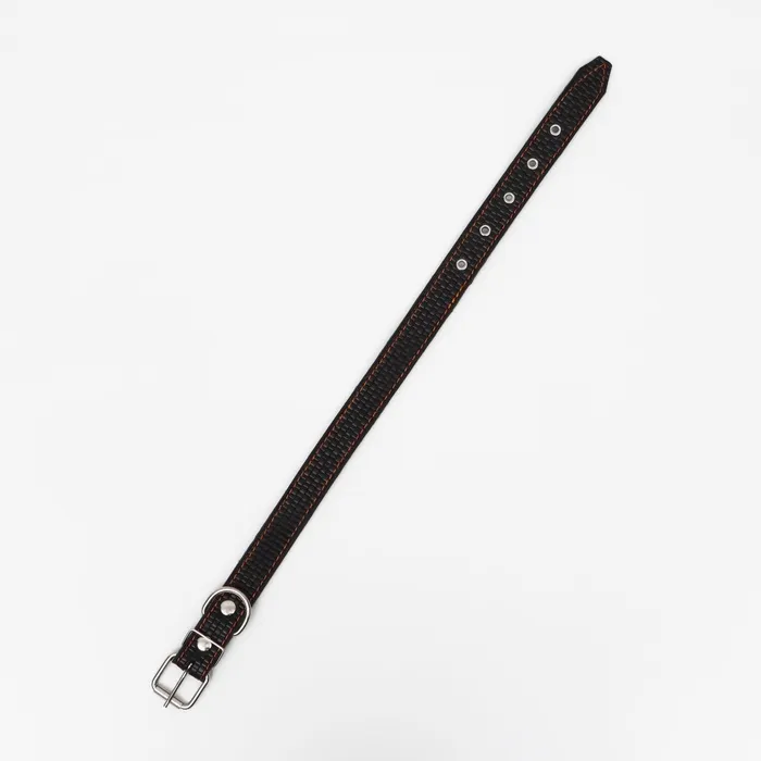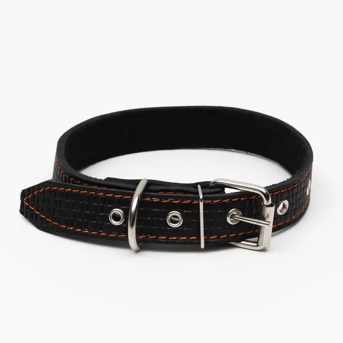 Прогулочный ошейник является неотъемлемой частью арсенала собачника. Наш кожаный ошейник обшит синтепоном с внутренней стороны. Эта особенность предназначена для дополнительного комфорта собаки, и при этом лента не причиняет вреда шерсти. Ошейник сшит из цельного куска кожи и прошит толстой капроновой ниткой, для того, чтобы ошейник радовал Вас и Вашего питомца продолжительное количество времени.