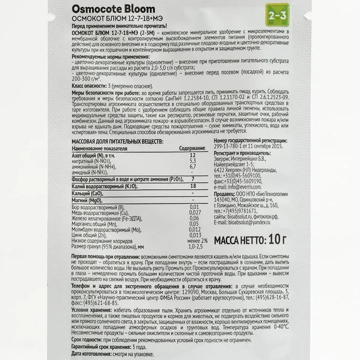 Экологическая безопасность: с минимальным выщелачиванием нитратов и фосфатов Osmocote Bloom не загрязняет грунт и грунтовые воды;
