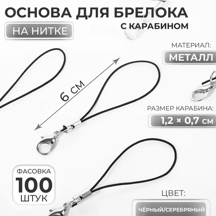 Основа для брелока на нитке, с карабином, 1.2×0.7 см, 6 см, цвет чёрный, серебряный — Характеристики