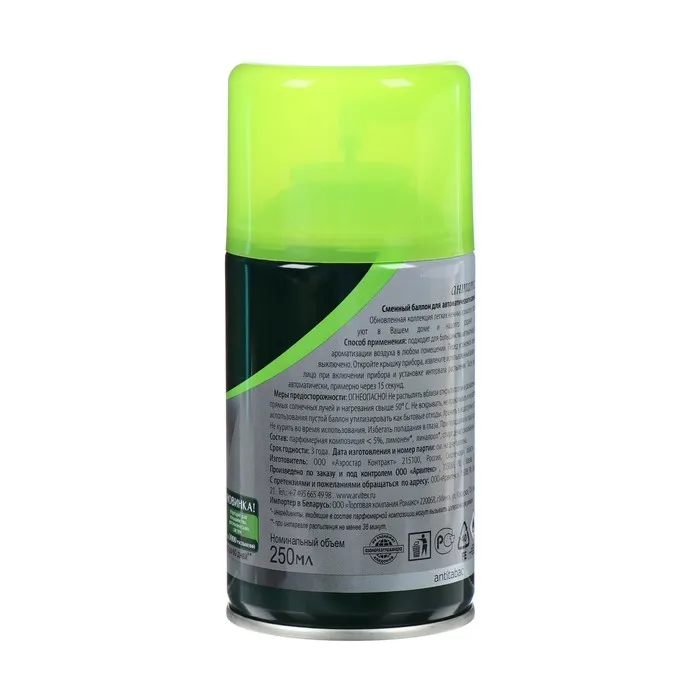 Способ применения: в соответствии с инструкцией для автоматического освежителя воздуха, вставить аэрозольный баллон в диспенсер и использовать освежитель по назначению.
