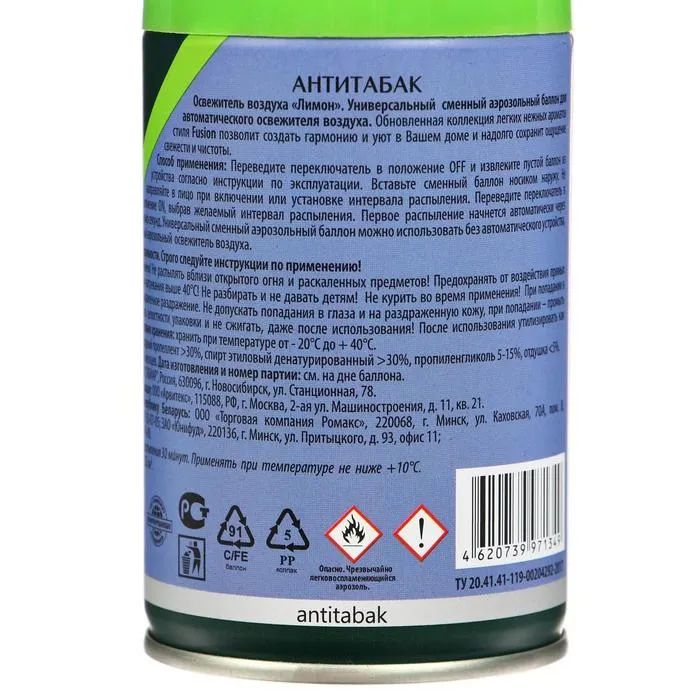 Состав: парфюмерная композиция 5%, лимонен, линалоол, спирт денатурированный 30%, пропан, бутан, изобутан 30%.