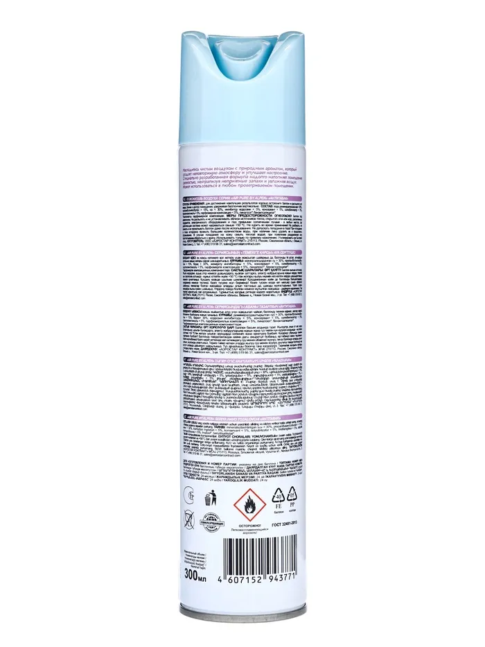 Способ применения: для получения наилучшего результата хорошо встряхнуть и держа баллончик вертикально, распылить вверх ближе к центру помещения.