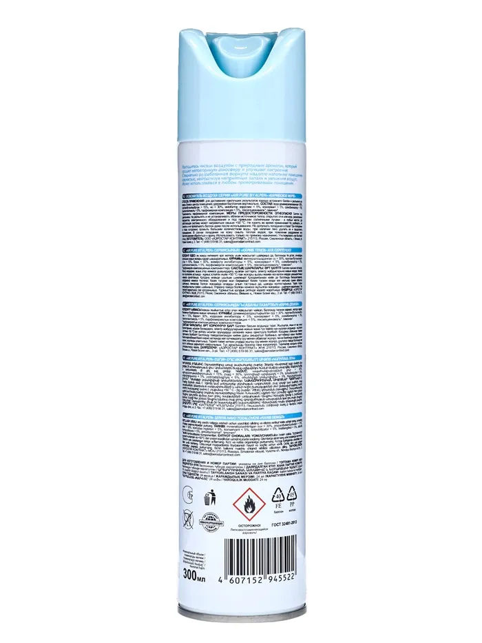Способ применения: для получения наилучшего результата хорошо встряхнуть и держа баллончик вертикально, распылить вверх ближе к центру помещения.