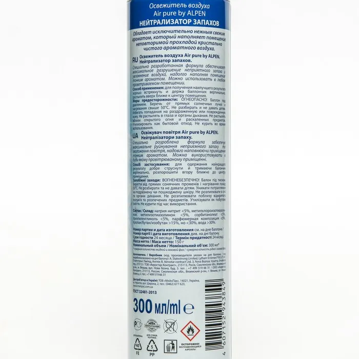 Освежитель воздуха Alpen, Нейтрализатор запахов, 300 мл — Характеристики