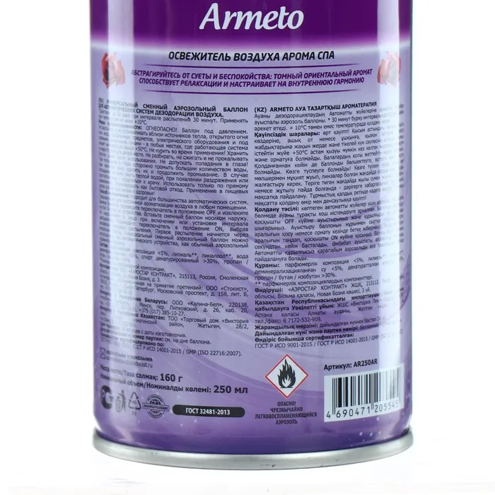 Способ применения: подходит для большинства автоматических систем. Предназначен для постоянной ароматизации воздуха в любом помещении. Замена баллона переведите переключатель в положение выкл и извлеките пустой баллон из устройства. Вставьте сменный баллон носиком наружу. Не направляйте в лицо при включении или установке интервала. Переведите переключатель в положение вкл, выбрав нужный интервал распыления. Первое распыление начнется через несколько секунд. Универсальный сменный аэрозольный баллон можно использовать без автоматического устройства, как обычный аэрозольный освежитель воздуха.