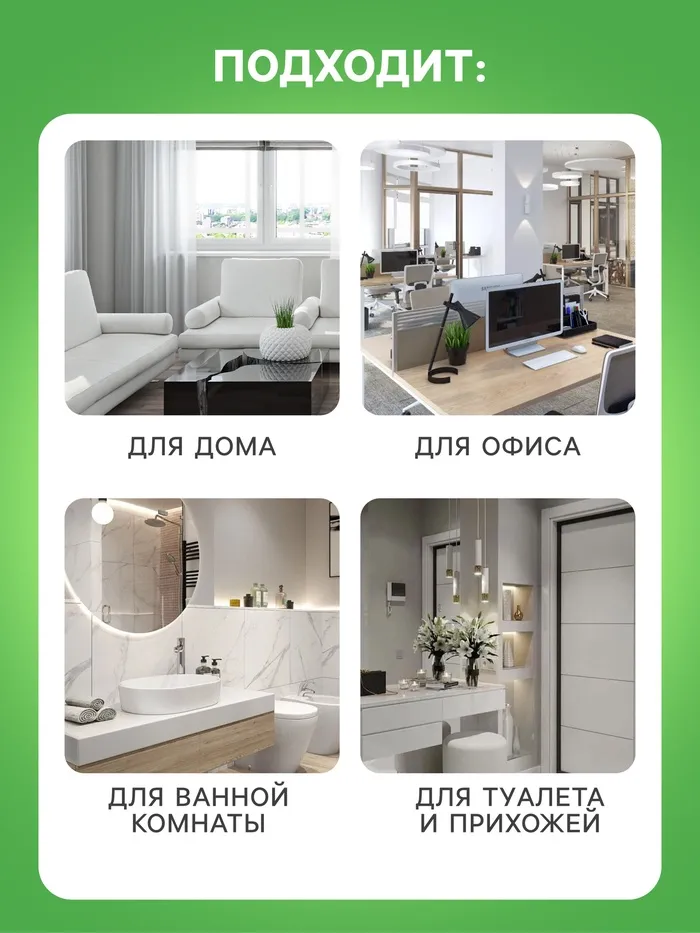 - "Сухое распыление" позволяет сохранить аромат на длительное время, не оставляет следов на кафельной плитке, потолке, обоях и гардинах.