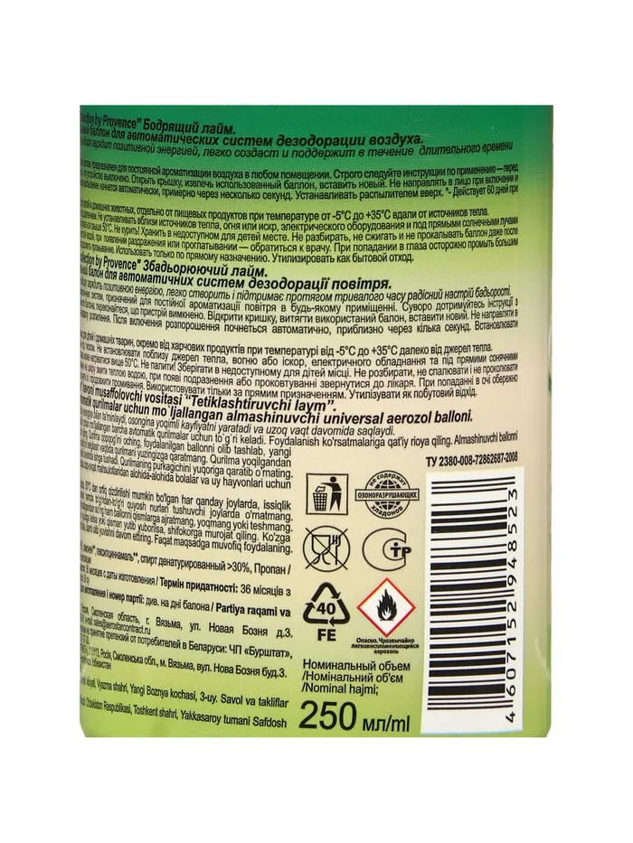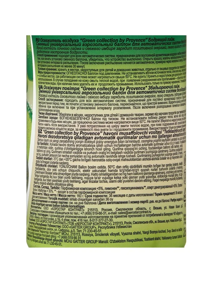 Освежитель воздуха «Green collection by Provence»: «Бодрящий лайм», универсальный сменный баллон — Характеристики