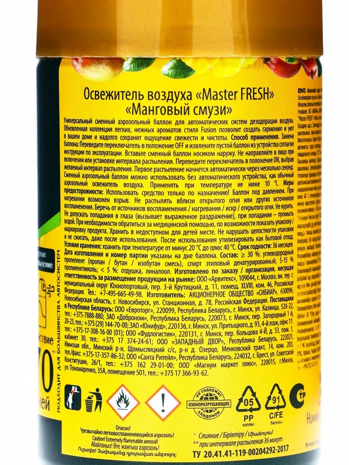 Освежитель воздуха Master FRESH GOLD Сменный баллон Манго Смузи безопасен для здоровья и не вызывает аллергических реакций. Он подходит для использования в любых помещениях, включая спальни, гостиные, кухни и ванные комнаты.