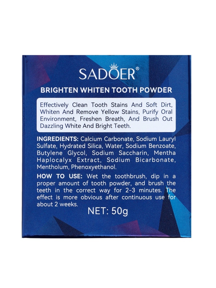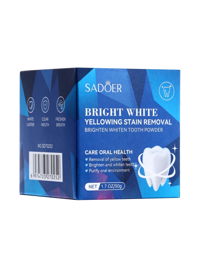 Отбеливающий зубной порошок SADOER — это современное средство для комплексного ухода за полостью рта, которое помогает вернуть естественную белизну зубов и поддерживать здоровье десен. Его формула разработана для безопасного и эффективного удаления налёта, потемнений и следов от кофе, чая, вина и других окрашивающих продуктов.