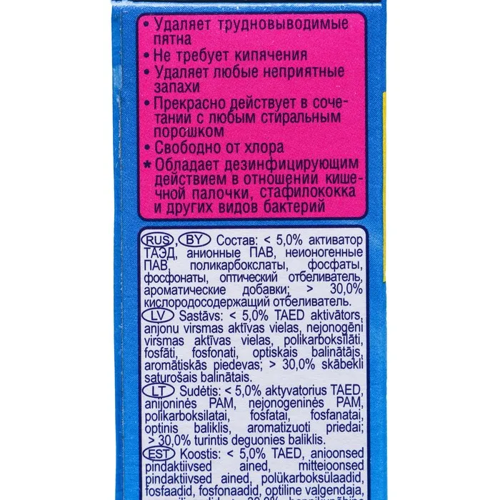 - отбеливает и дезинфицирует при пониженной температуре от 30 до 50 °С;