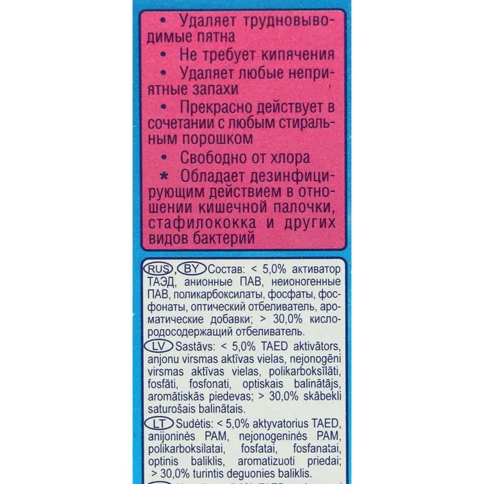 - отбеливает и дезинфицирует при пониженной температуре от 30 до 50 °С;