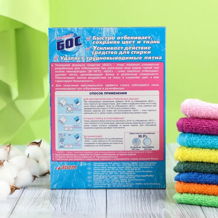 Отбеливатель "Аист" "Бос-плюс" Maximum, порошок, для тканей, 600 г — Характеристики