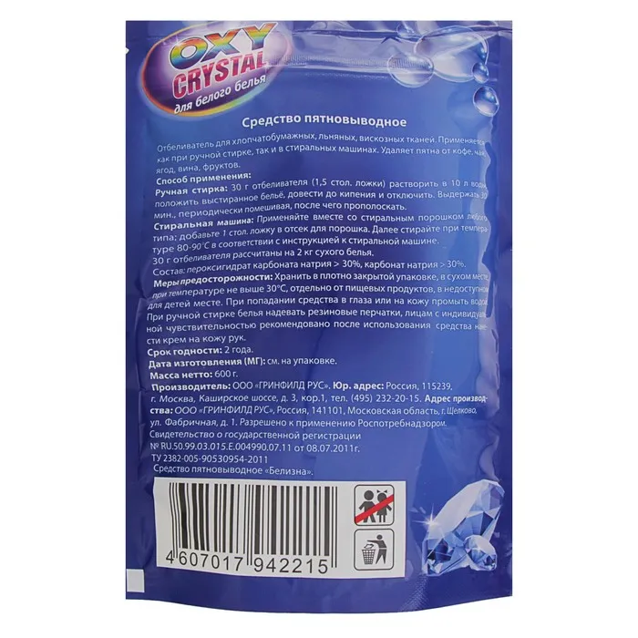 Отбеливатель для хлопчатобумажных, льняных, вискозных тканей. Применяется как при ручной стирке, так и в стиральных машинах. Удаляет пятна от кофе, чая, ягод, вина, фруктов.