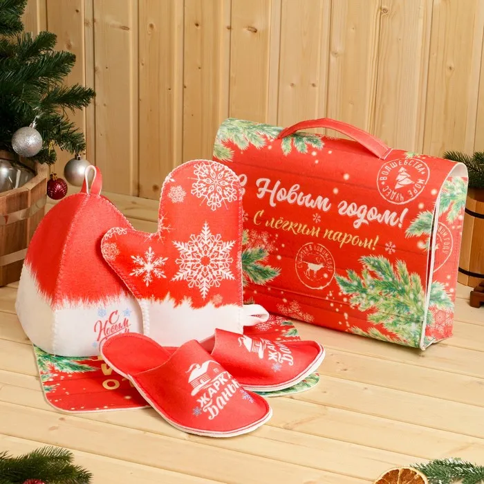 Набор для бани с принтом «С новым годом!», 5 предметов: шапка, рукавица, тапочки, коврик, войлок, красный, «Банная забава»