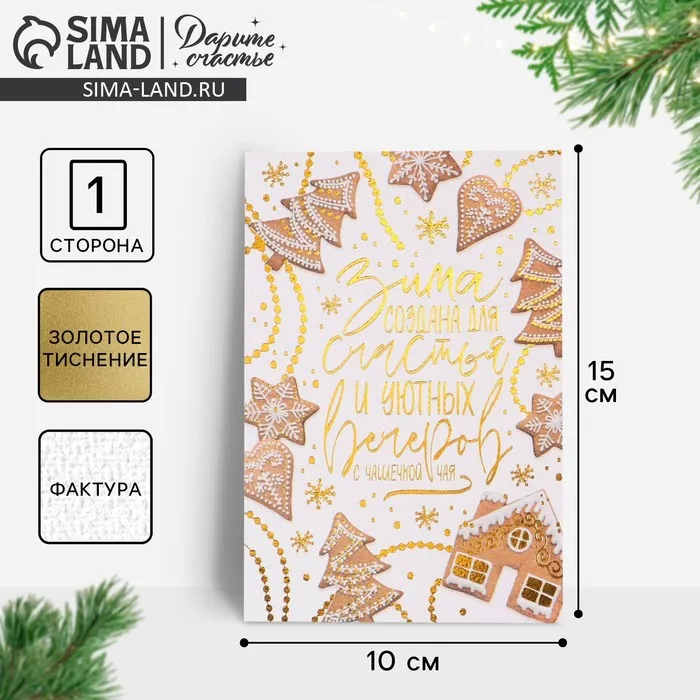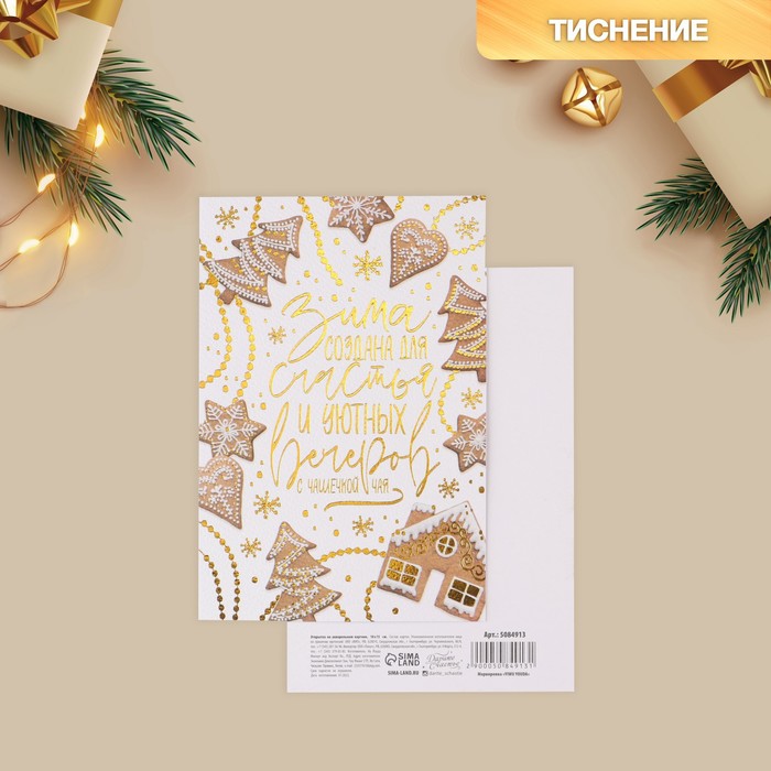 Открытка с новым годом на акварельном картоне «Имбирное печенье», тиснение, 10 х 15 см — Характеристики